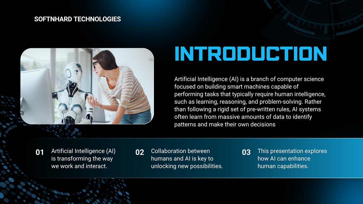 Artificial Intelligence (AI) is the ability of machines or software to simulate human intelligence to perform tasks like learning, reasoning, and problem-solving. It powers many of the services we use daily, from smartphone assistants to personalized movie recommendations.